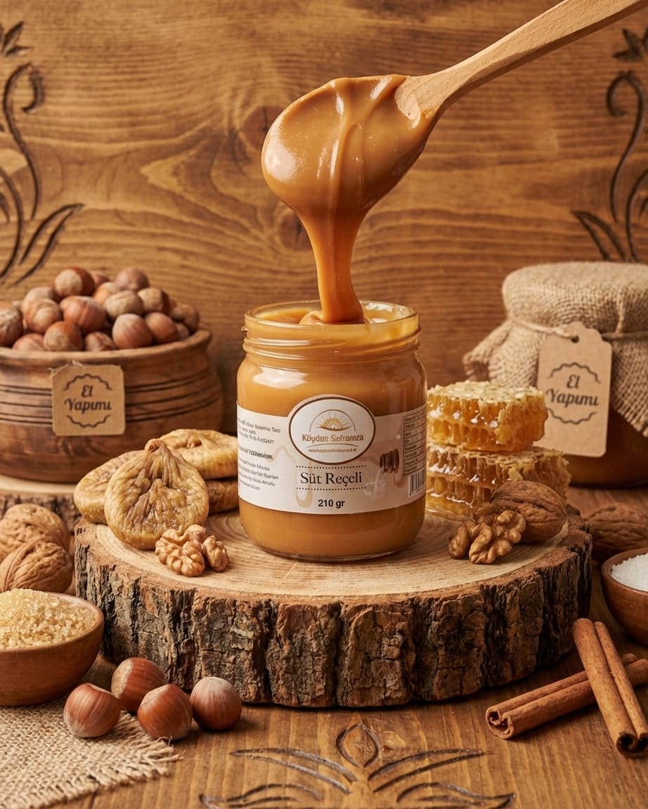 “Köyden Sofranıza Süt Reçeli”, taze köy sütlerinin ve şekerin taş kazanlarda saatlerce ağır ağır karıştırılmasıyla elde edilen, sabır ve emek dolu geleneksel bir lezzettir. Modern fabrikasyon ürünlerin aksine; kıvam artırıcı, koruyucu veya kimyasal katkı maddesi içermez. Sütün içindeki doğal laktozun karamelize olmasıyla o meşhur altın rengini ve pürüzsüz, ipeksi dokusunu kazanır.